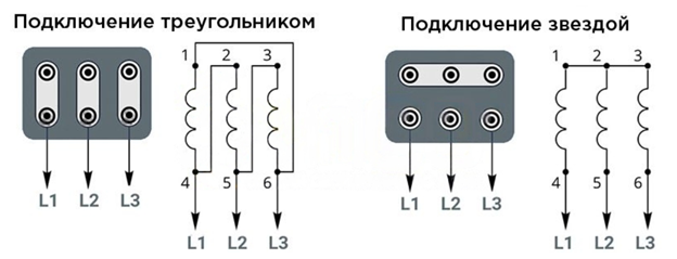 Электроподключение: выполняется через клеммную коробку (борно) с шестью выводами, что позволяет менять схему соединения обмоток "звезда" или "треугольник" в зависимости от напряжения сети . Трехфазные двигатели изготавливаются на напряжения 380, 660, 220/380, 380/660 В .