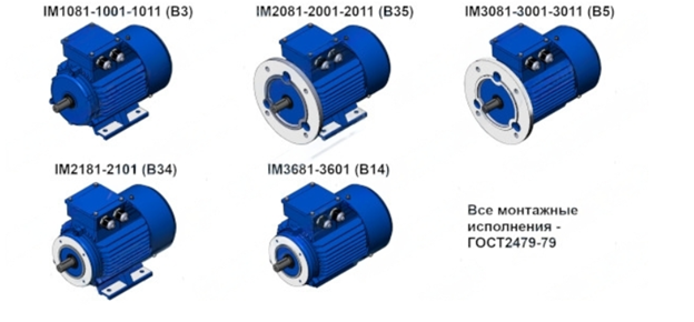 Способы крепления АИР (монтажные исполнения): двигатели выпускаются в различных исполнениях по способу монтажа согласно ГОСТ 2479-79 :