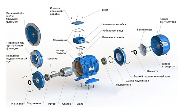 · Ротор — короткозамкнутый ("беличья клетка") из стального сердечника с залитыми алюминиевыми стержнями, замкнутыми торцевыми кольцами .